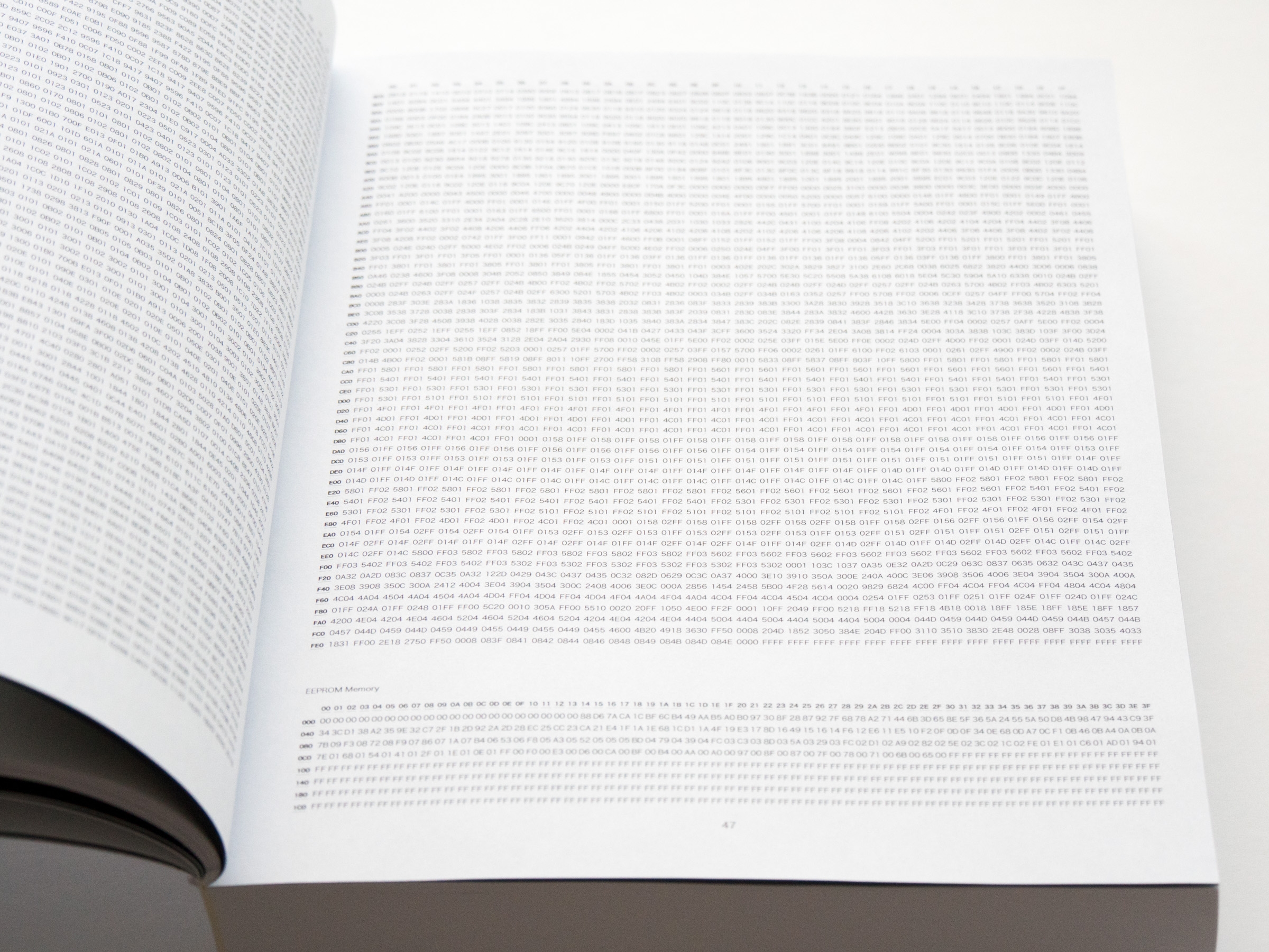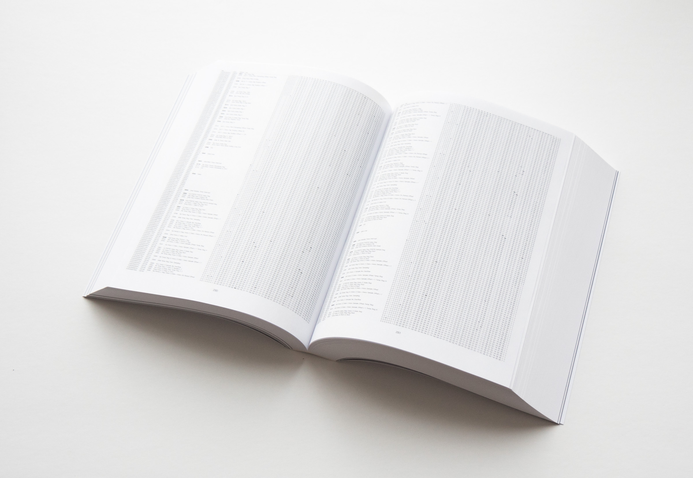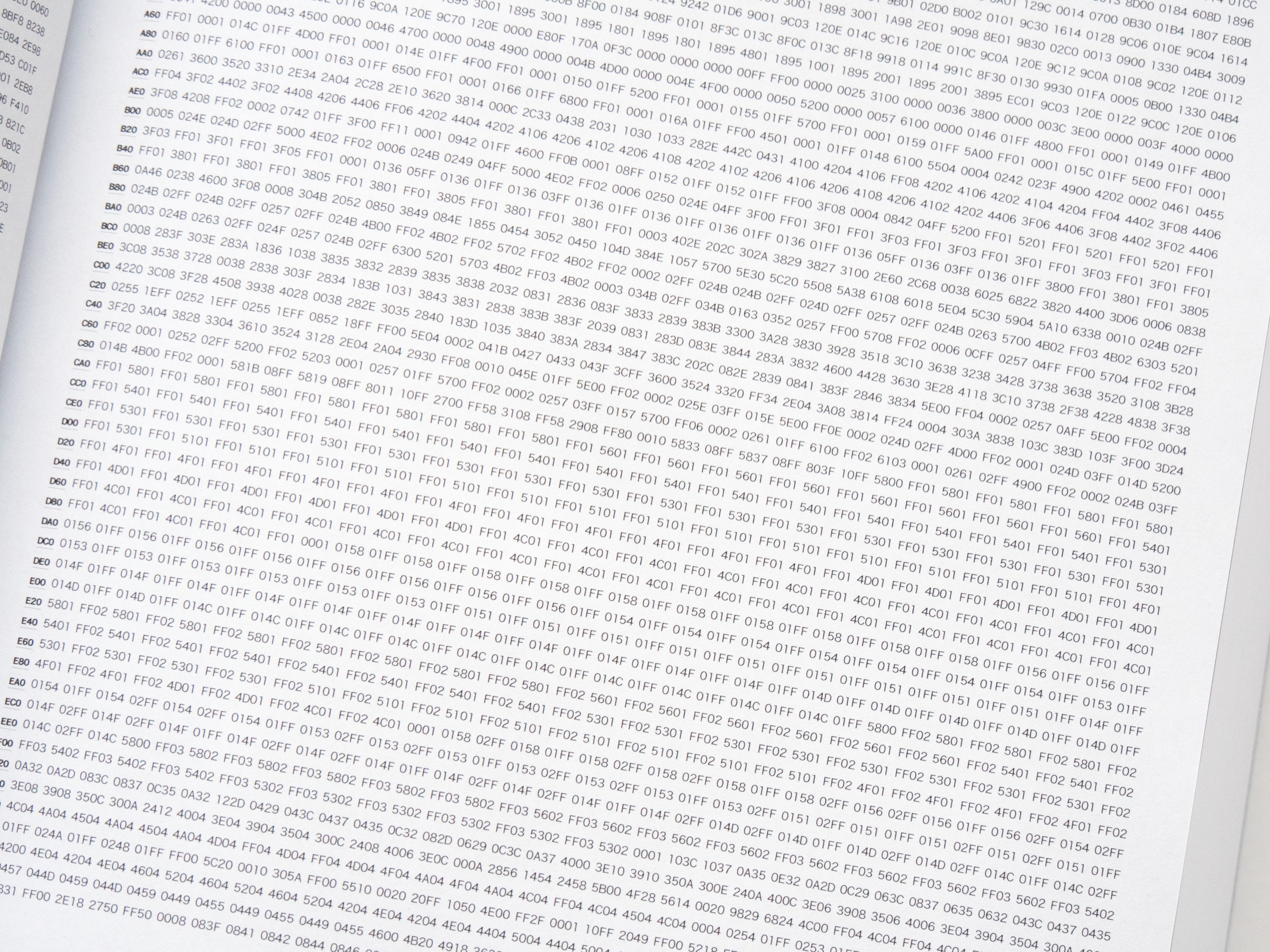 0.01s, Perich's companion to 1-Bit Symphony, is a voluminous synthesis of sound and computation in book form, giving a tangible mass to the code behinds its music. Digging even deeper into the basic operations of computation, 0.01s captures the inner workings of 1-Bit Symphony over the first hundredth of a second after it is switched on. In just 0.01 seconds, its processor executes 80,000 computational cycles, enough information to fill a 695-page book with austere tables of numbers and machine language, becoming a visual meditation on the internal mechanics of computation.