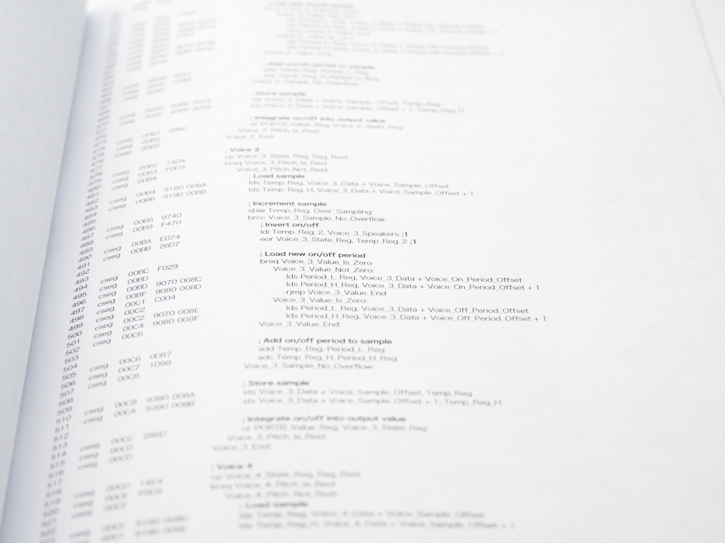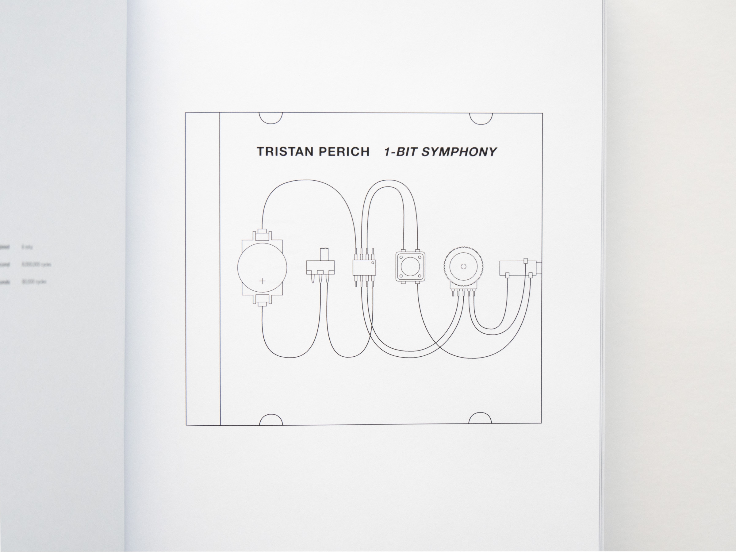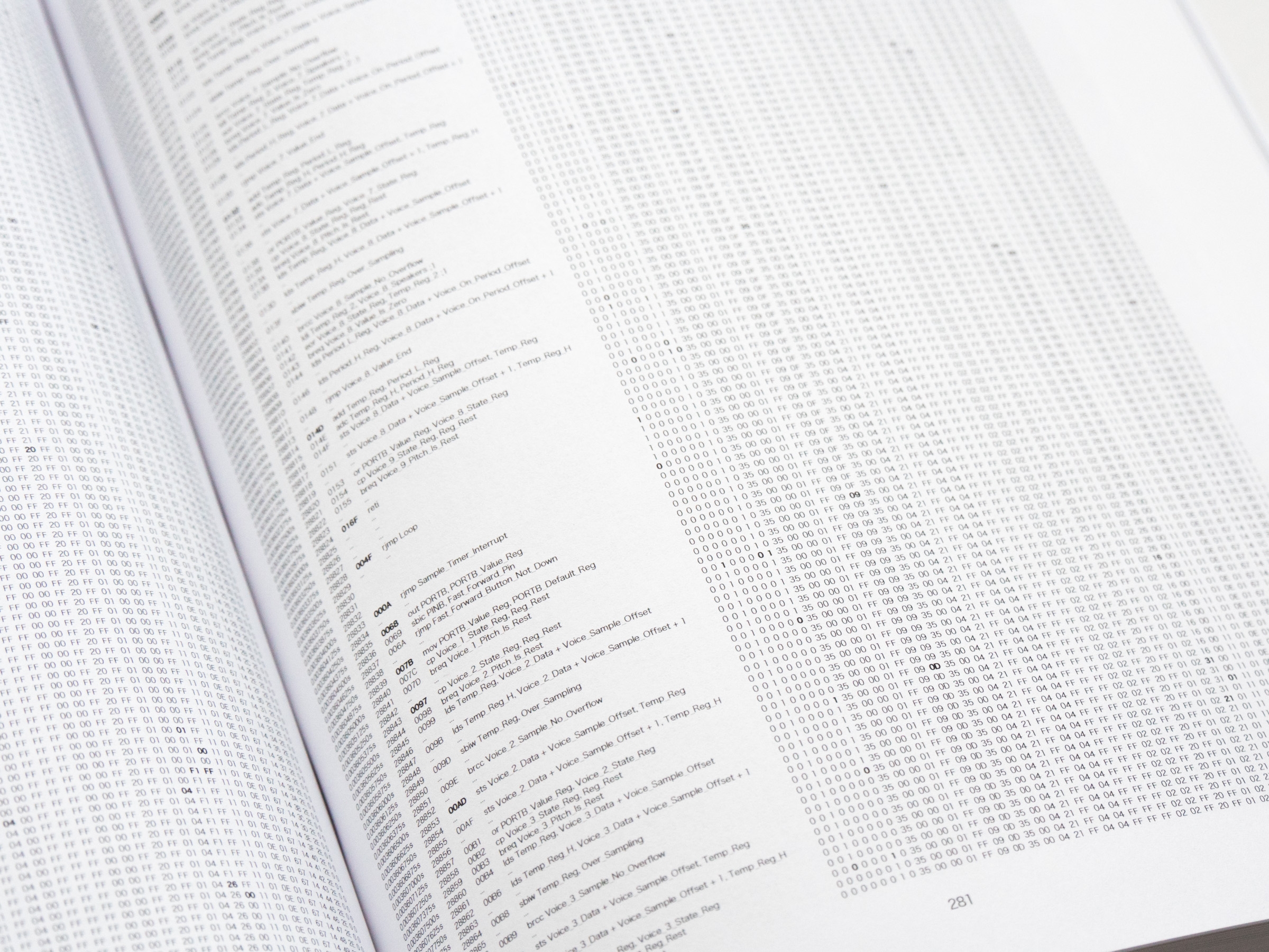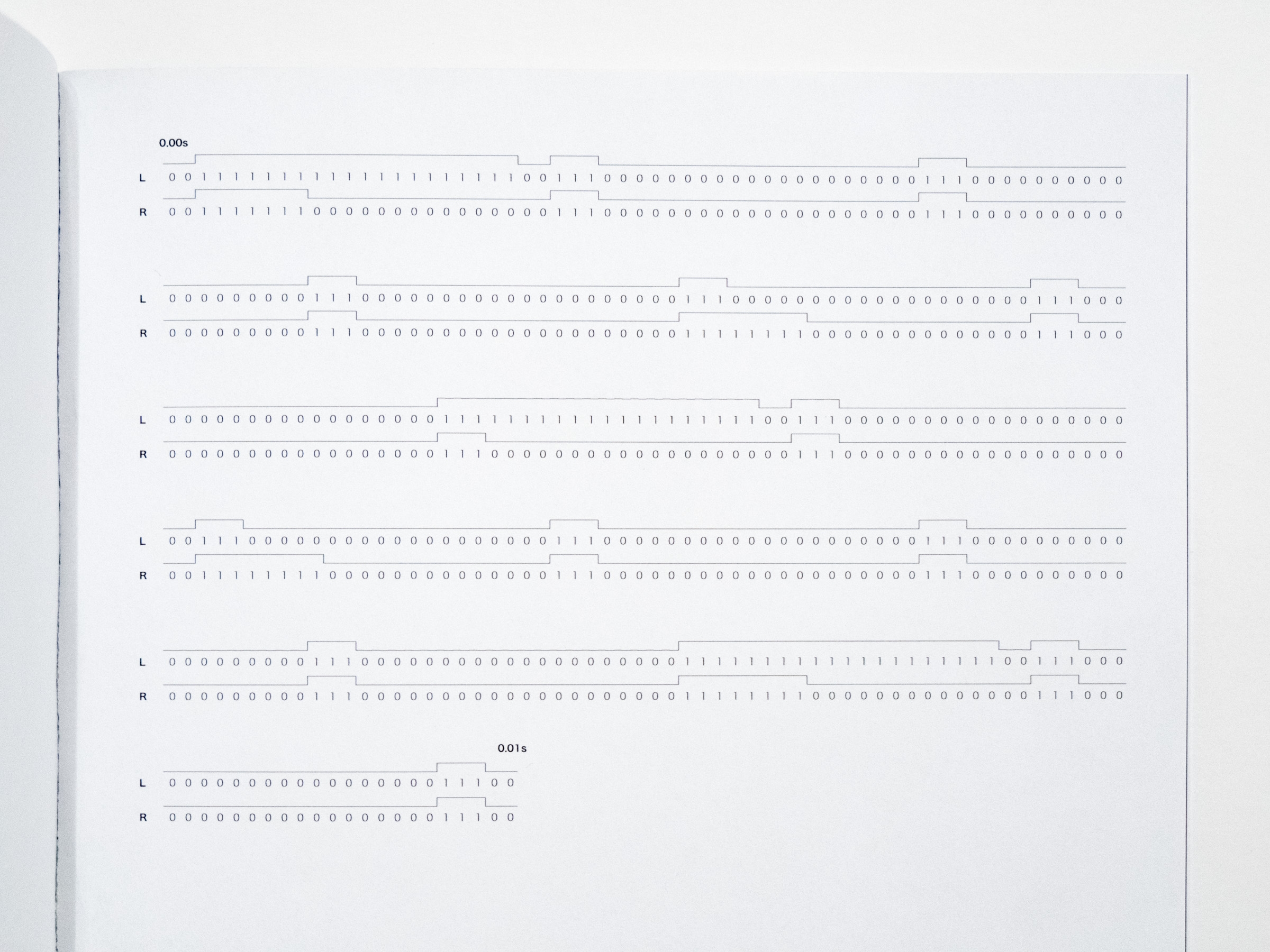 0.01s, Perich's companion to 1-Bit Symphony, is a voluminous synthesis of sound and computation in book form, giving a tangible mass to the code behinds its music. Digging even deeper into the basic operations of computation, 0.01s captures the inner workings of 1-Bit Symphony over the first hundredth of a second after it is switched on. In just 0.01 seconds, its processor executes 80,000 computational cycles, enough information to fill a 695-page book with austere tables of numbers and machine language, becoming a visual meditation on the internal mechanics of computation.