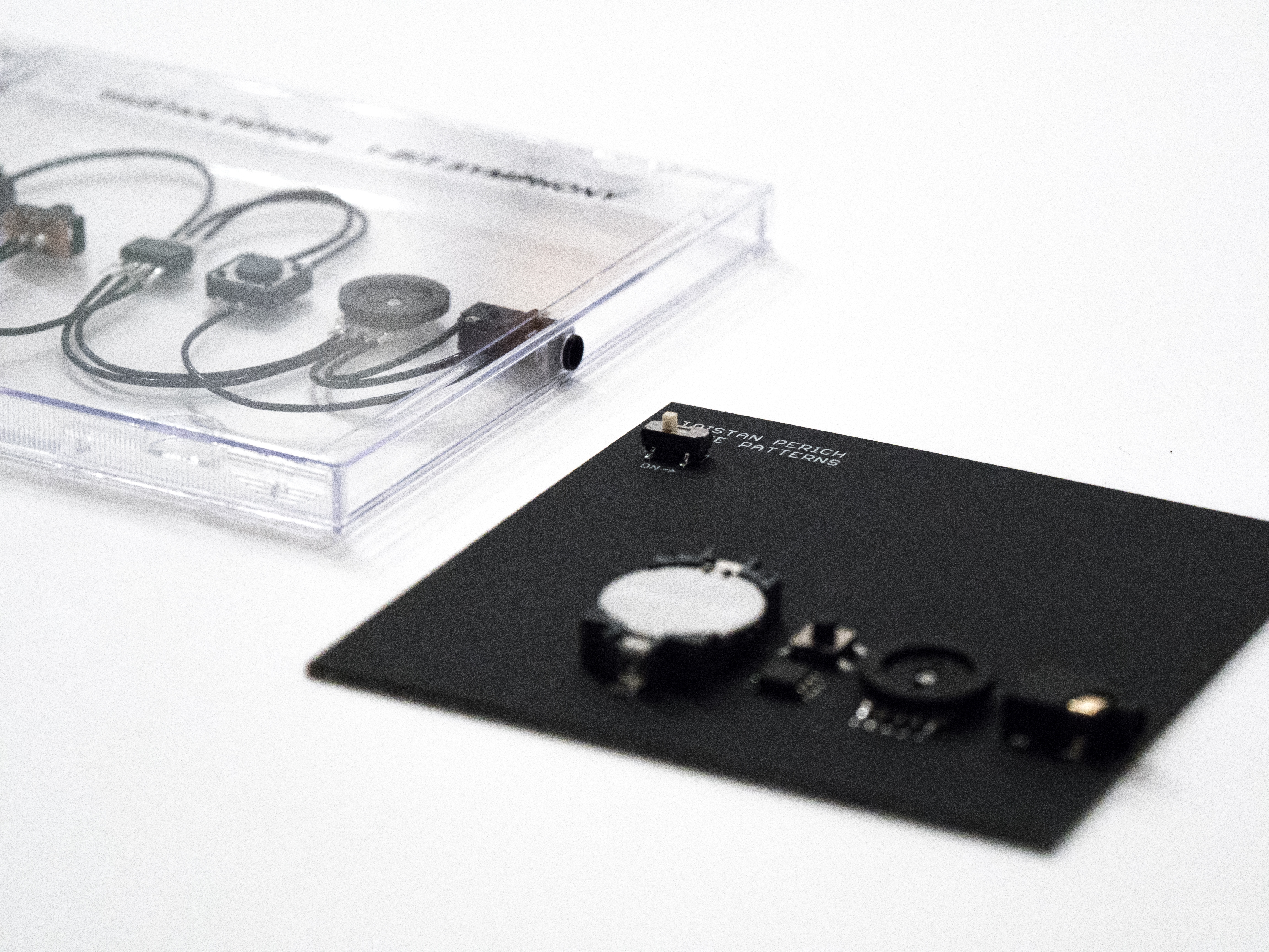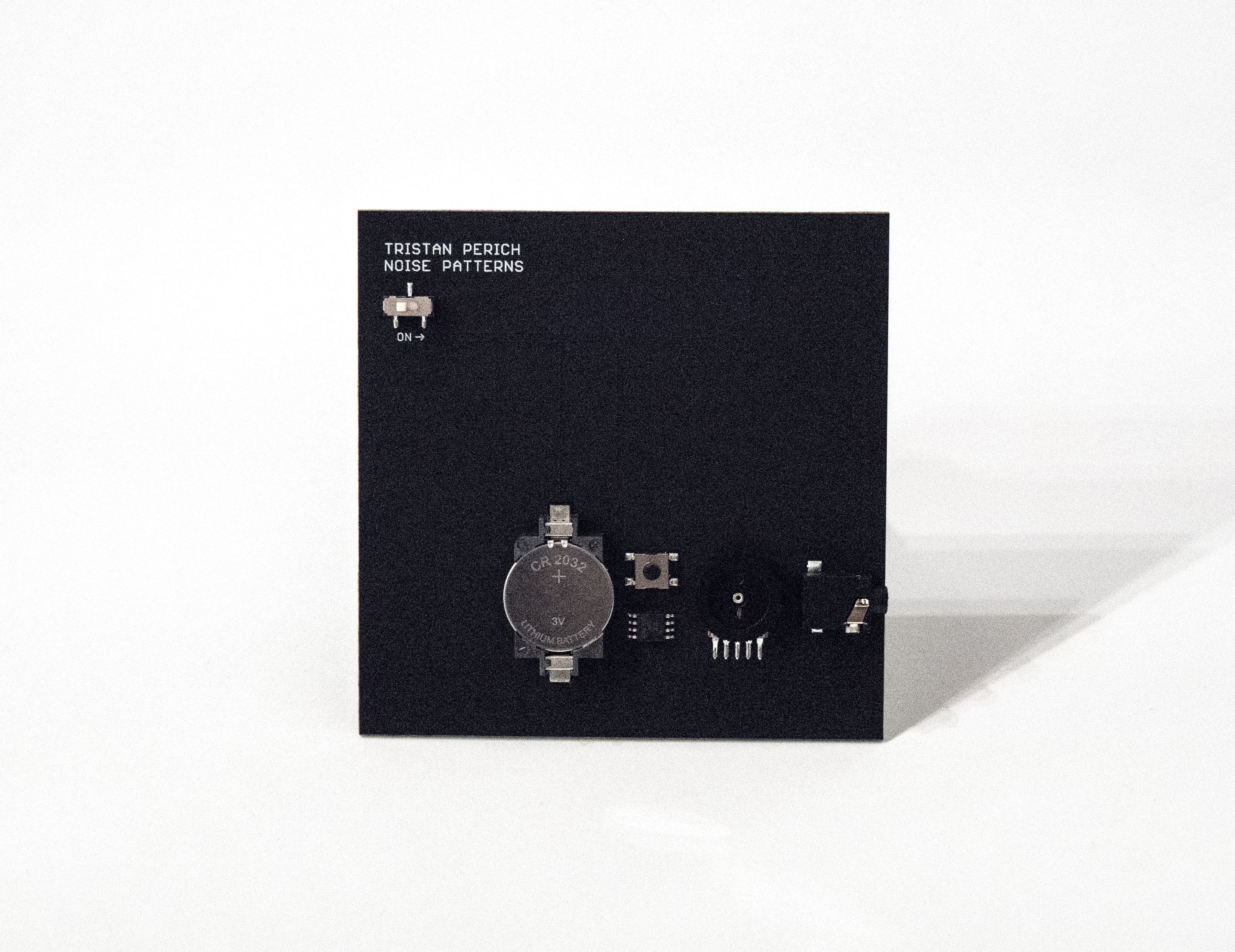 Noise Patterns digs into the primitive particles of digital 1-bit audio that has become Perich's signature sound. As with his previous circuit albums, Noise Patterns is not released as a CD or record. Noise Patterns comes as a minimalist matte-black circuit board with a headphone jack in the side. Plug in and switch it on to listen to Perich's music unfold. The 6-track album explores how digital noise can be shaped and stressed, from glittering static into the mesmerizing electronic thump of a nightclub. On a technical level, the sonic raw material in Noise Patterns is digital 1-bit noise: a probabilistic density of random oscillations that Perich sequences into rhythmic patterns and layers into textures, pulses, rumbles and beats. These sounds are Perich's very own, programmed by the artist and synthesized in real-time as the circuit plays. The physical format of Noise Patterns reveals how Perich engages music at all levels, from sound all the way down to the binary instructions of the hardware.