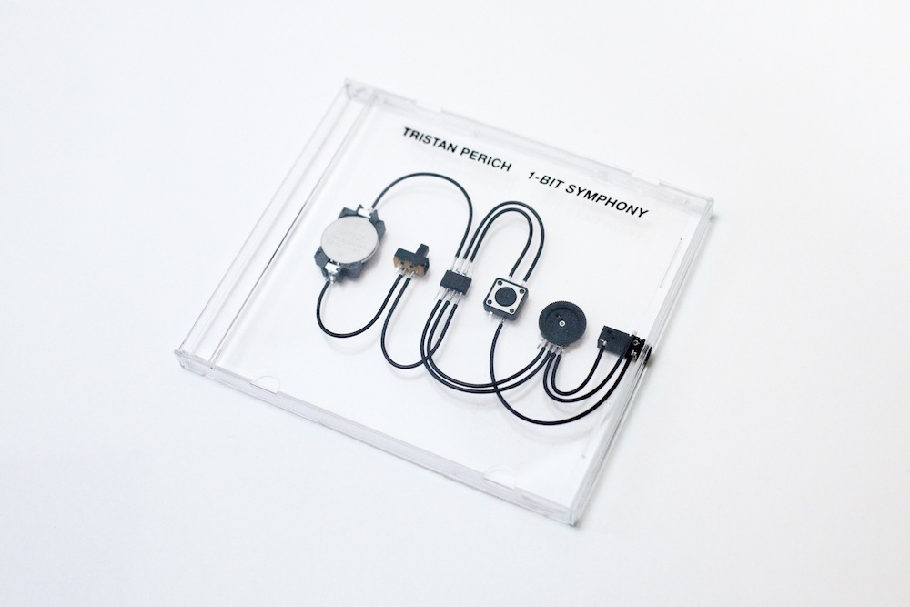 Tristan Perich's 1-Bit Symphony is a dazzlingly low-fi electronic composition in five movements on a single microchip. A complete electronic circuit utilizes on and off electrical pulses, synthesized by assembly code, to manifest data as sound. The Wall Street Journal wrote, “Its oscillations have an intense, hypnotic force and a surprising emotional depth.” The device treats electricity as a sonic medium, making an intimate connection between the materiality of hardware and the abstract logic of software.
