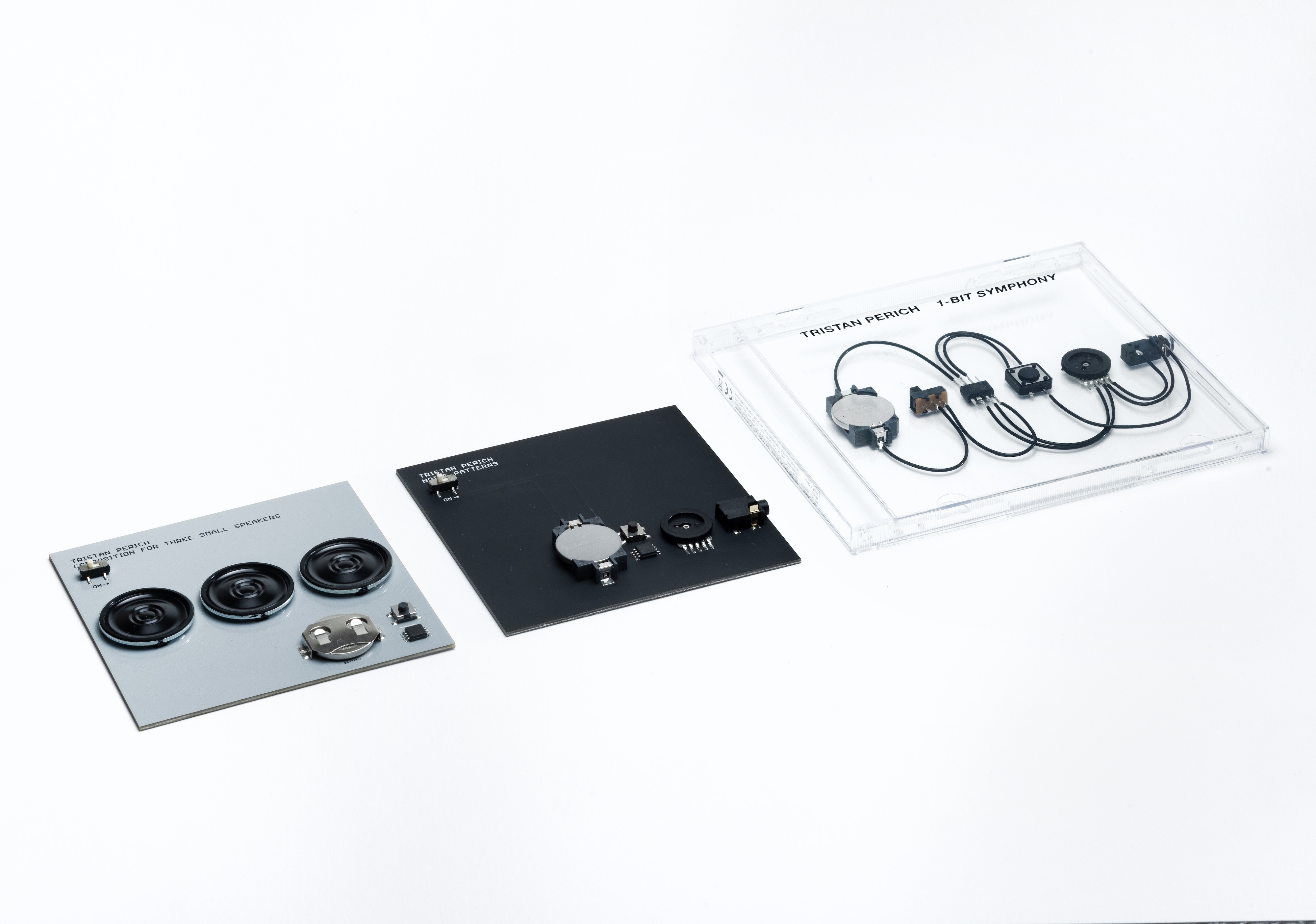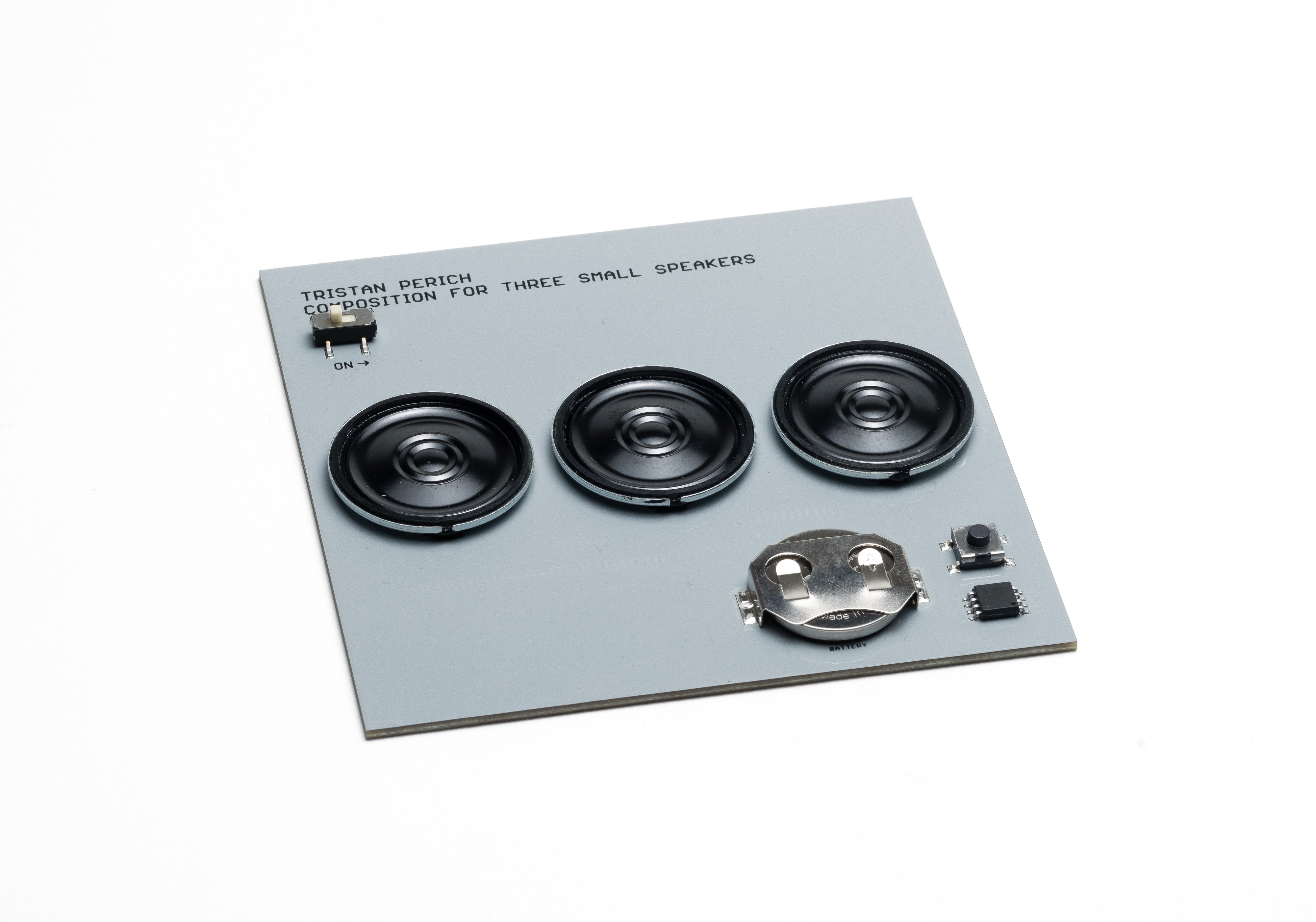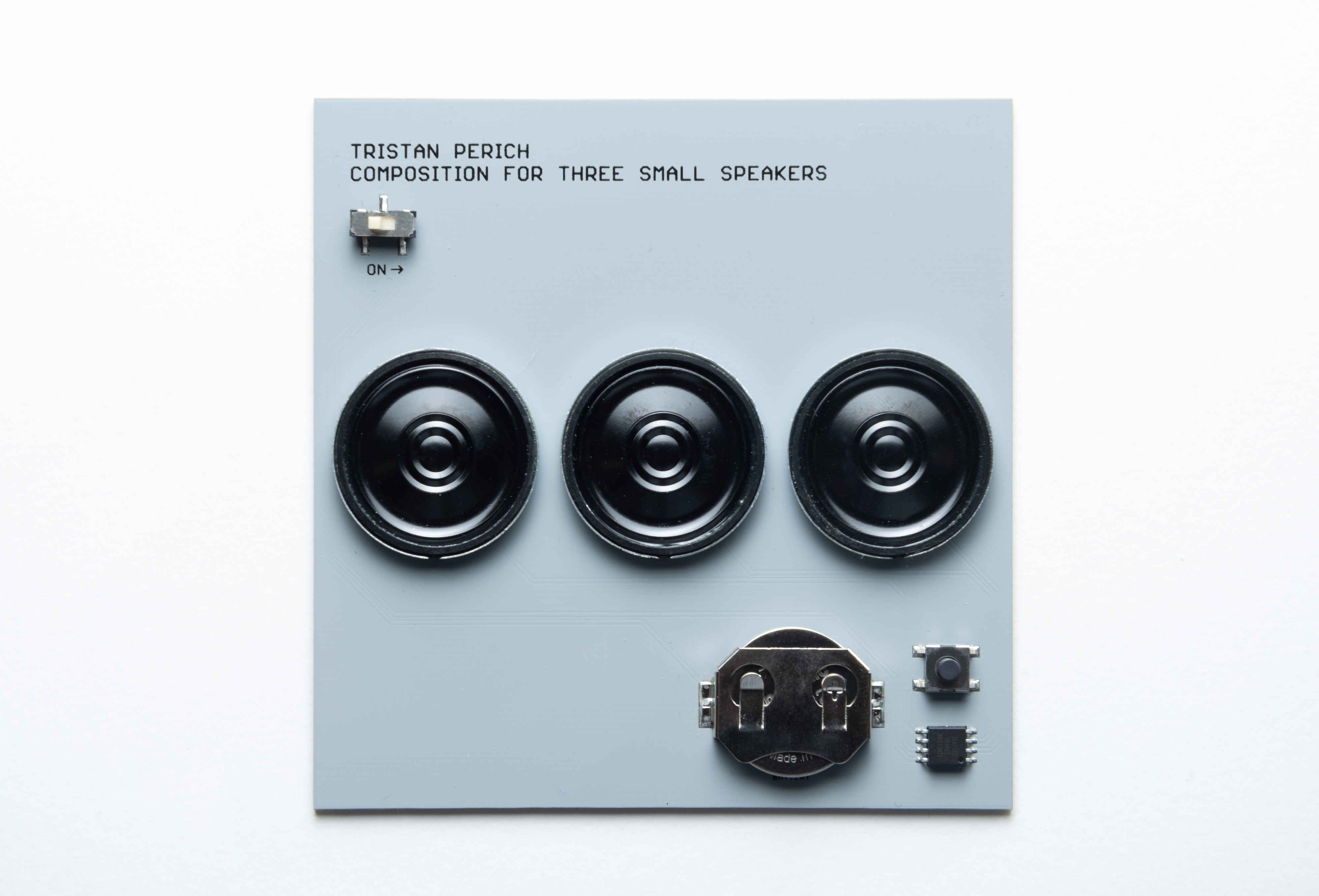 Tristan Perich's newest circuit album, Composition for Three Small Speakers, comes as an electronic device that plays its three-channel music live. Following on his previous circuit albums (1-Bit Symphony, Noise Patterns, 1-Bit Music), Composition for Three Small Speakers is both a composition and a performance. When turned on, its music is synthesized in real-time by code programmed by the artist. Making a physical connection between code and hardware, the music was written to be performed by the same speakers the listener holds in their hands.