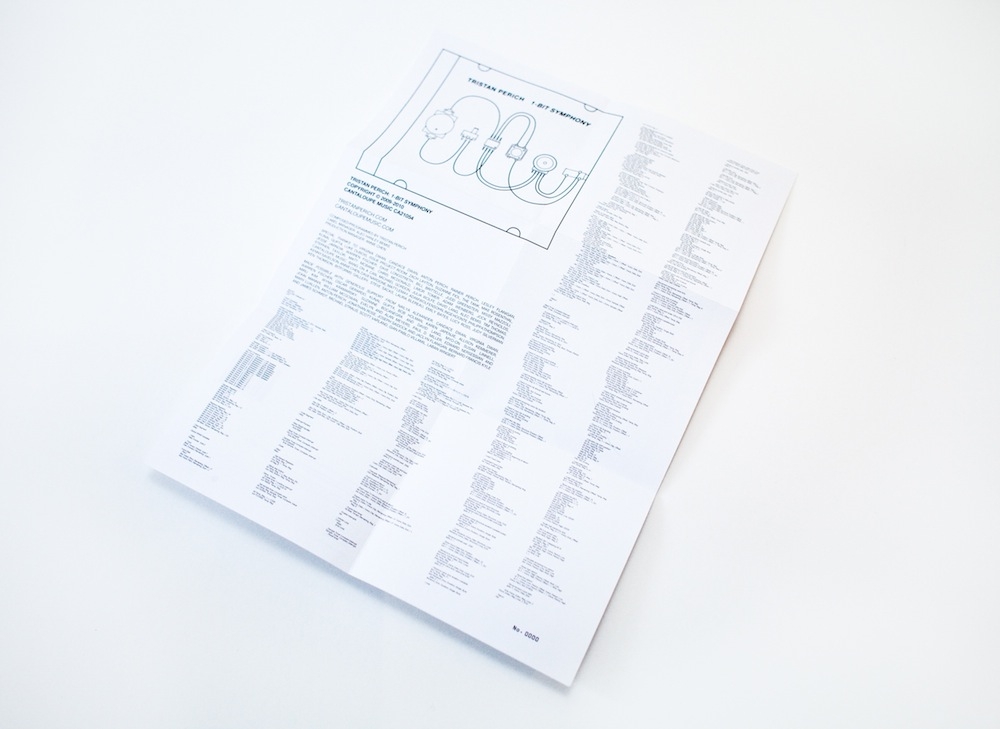 Tristan Perich's 1-Bit Symphony is a dazzlingly low-fi electronic composition in five movements on a single microchip. A complete electronic circuit utilizes on and off electrical pulses, synthesized by assembly code, to manifest data as sound. The Wall Street Journal wrote, “Its oscillations have an intense, hypnotic force and a surprising emotional depth.” The device treats electricity as a sonic medium, making an intimate connection between the materiality of hardware and the abstract logic of software.