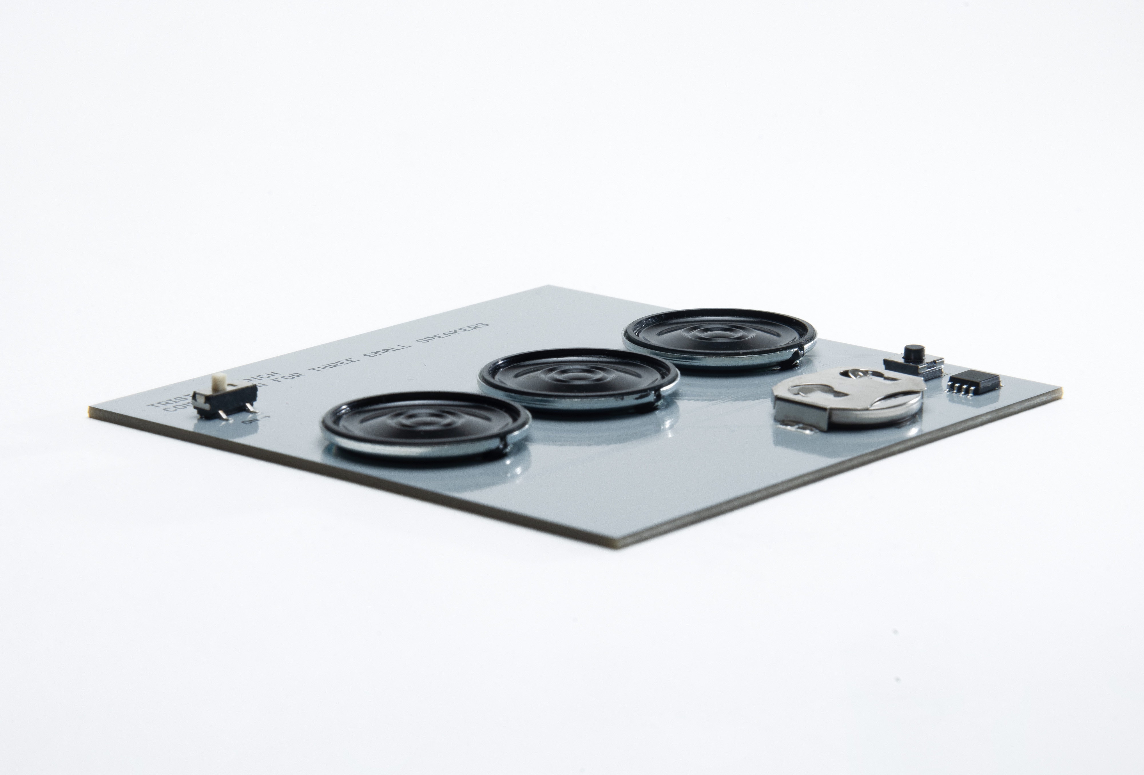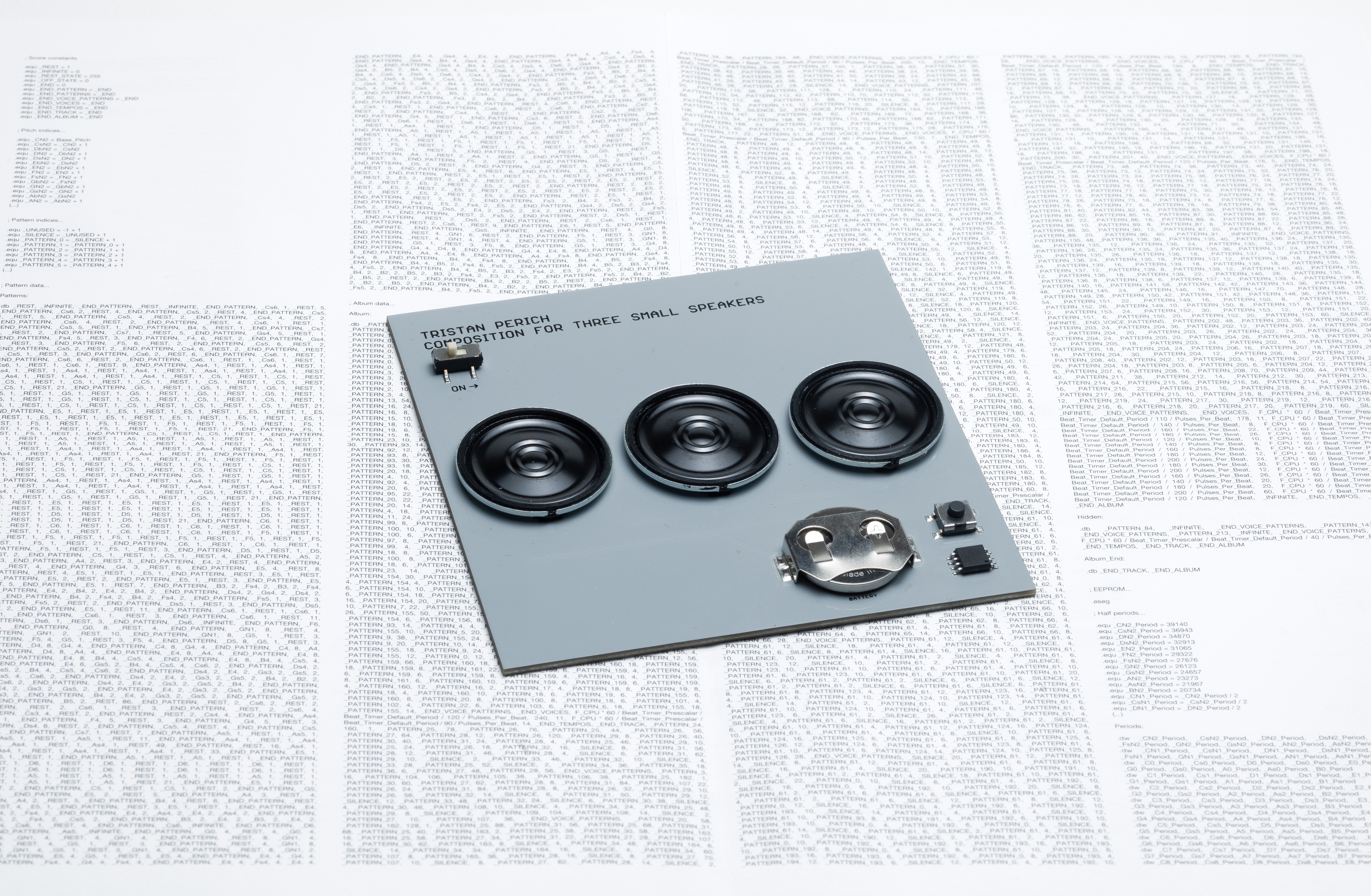 Tristan Perich's newest circuit album, Composition for Three Small Speakers, comes as an electronic device that plays its three-channel music live. Following on his previous circuit albums (1-Bit Symphony, Noise Patterns, 1-Bit Music), Composition for Three Small Speakers is both a composition and a performance. When turned on, its music is synthesized in real-time by code programmed by the artist. Making a physical connection between code and hardware, the music was written to be performed by the same speakers the listener holds in their hands.