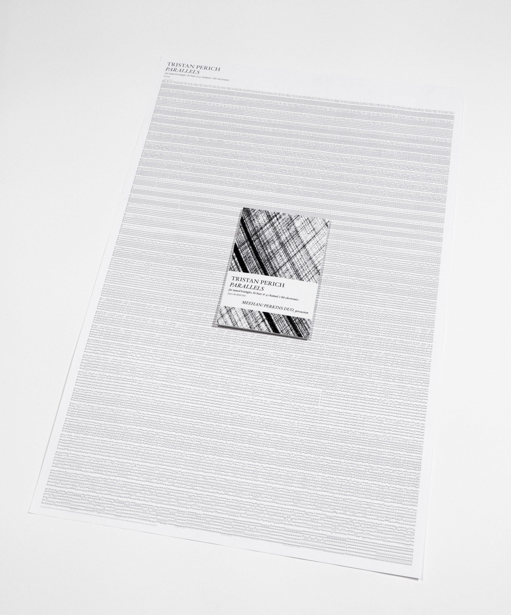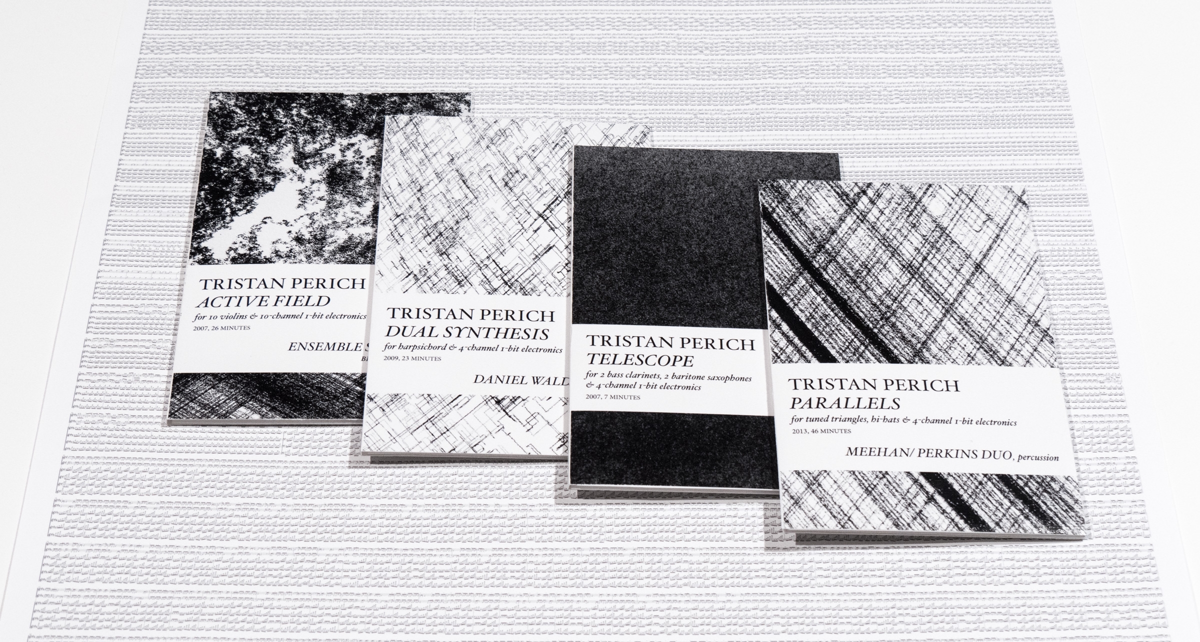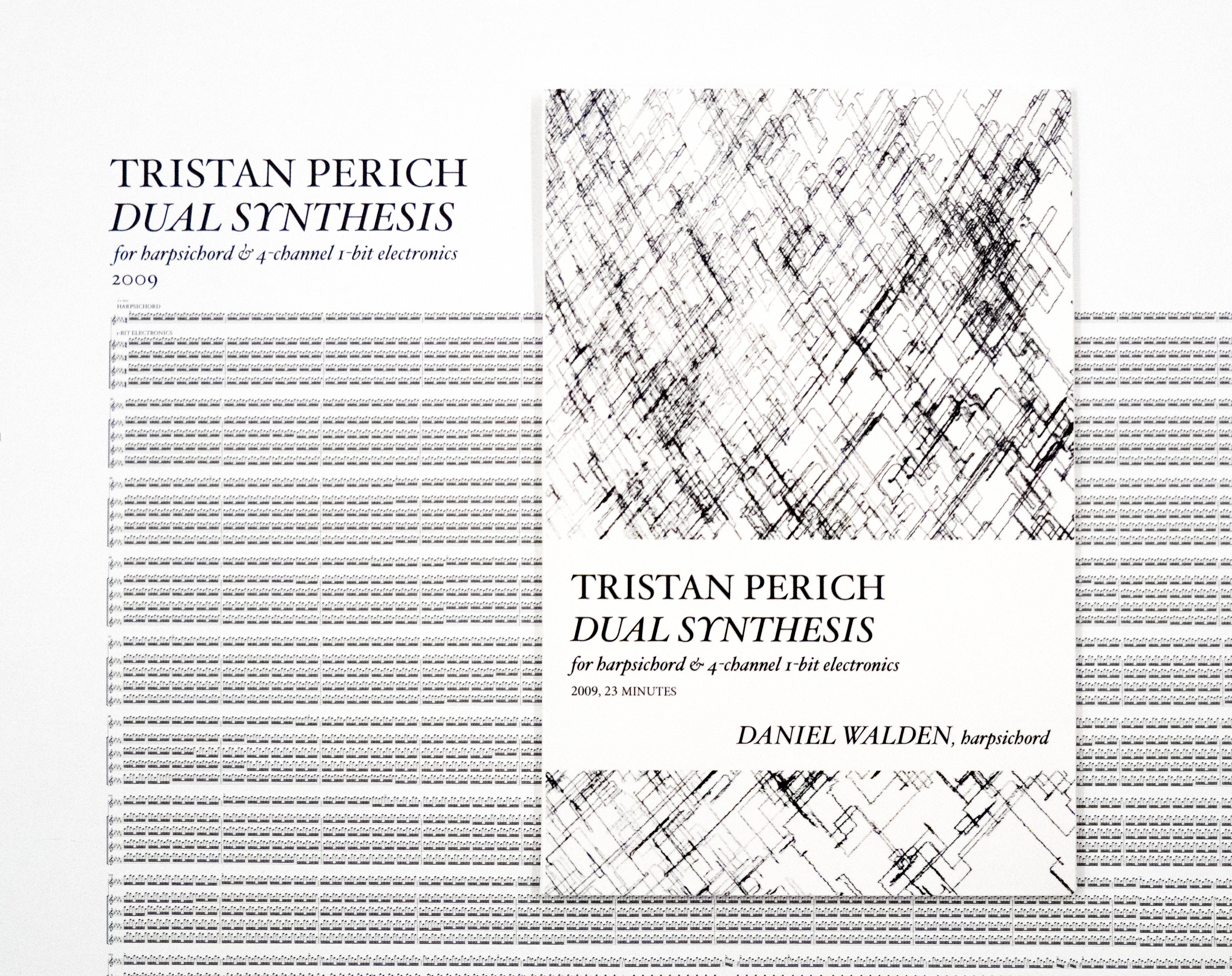 Tristan Perich's "Compositions," is a new series of recordings of his composed works for acoustic instrumentation with 1-bit electronics, released individually on CD in special packaging that includes their full musical scores printed in poster form. This year, four works will be released, scored as duos between percussion, winds, harpsichord, strings and his 1-bit electronics, featuring performances by Meehan/ Perkins Duo, Ensemble Signal, Daniel Walden and others.